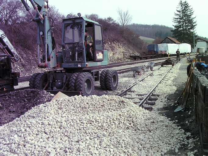 mit dem Bagger im Gleisbereich verteilt. Dort, wo der Bagger nicht mehr